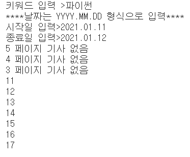 결과값이 있을 경우이다. 즉 기사가 있다는 뜻인데, 이 경우에는 기사값을 파악해야해서 또 for 구문과 try, except구문을 사용했따.